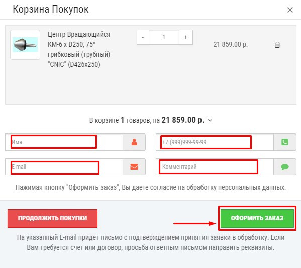 - оформить заказ на сайте (в карточке товара нажмите кнопку "В корзину", либо "Купить в один клик", в появившейся форме введите контактные данные и комментарии и нажмите кнопку "Оформить заказ", см. изображения),