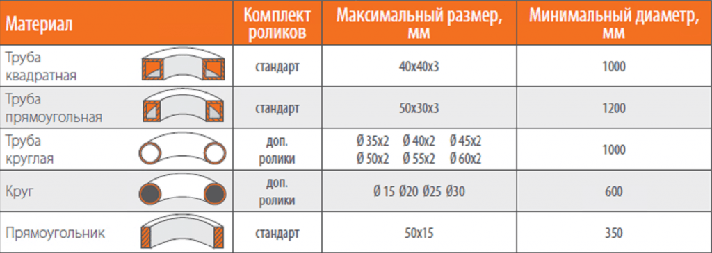 В комплектации стандартный комплект роликов для изгибания квадратной и профильной трубы, а также прямоугольника максимального размера 50х15мм с минимальным диаметром 350мм.