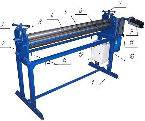 С помощью прижимных винтов (7) поднять вверх прижимной вал (4). Вальцуемый лист (13) расположить между опорными (5) и прижимным (4) валами (заготовка должна располагаться параллельно валам). Далее равномерным вращением прижимных винтов (7) опускаем постепенно ( ½ оборота) прижимной вал (4) на величину, необходимую для формирования требуемого радиуса вальцевания. Вальцевание листа осуществляется вращением электромеханического привода (связанного с опорными валами через шестерни), при помощи нажатия реверсивных педалей (16) на выносном пульте (9). Смена возвратно-поступательного движения валов осуществляется через кнопку СТОП.