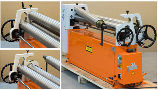 Вальцовочный станок предназначен для предания листу цилиндрической формы различного радиуса, данное оборудование широко применяется для изготовления комплектующих вентиляции, водосточного оборудования, в случаях производства цилиндрических и конических изделий, правке плоских заготовок, подгибке кромок. Выносная педаль дублируется пультом управления на станине станка. Цепная передача передаёт вращение с электродвигателя на валы. Верхний вал откидной, для легкого снятия готовых изделий. Откидной вал оснащен замком для предотвращения его самопроизвольного раскрытия в процессе работы.