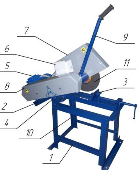 - На маятниковом узле смонтирован двигатель 3 кВт (5), пускатель (6) , кожух отрезного круга (7), кожух ремня (8);